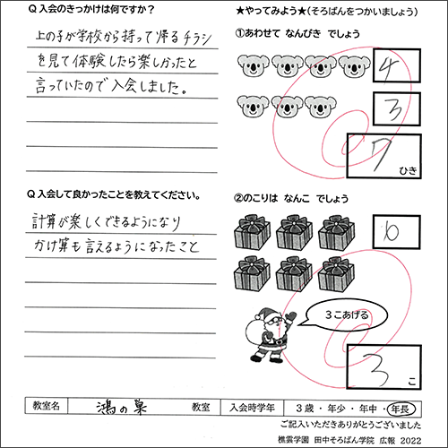 上の子が学校から持って帰るチラシを見て体験したら楽しかったと言っていたので入会しました。
