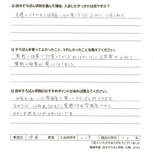 算数の授業で計算のスピードがはやくなって、正解率が上がり、算数の授業が楽しくなりました。