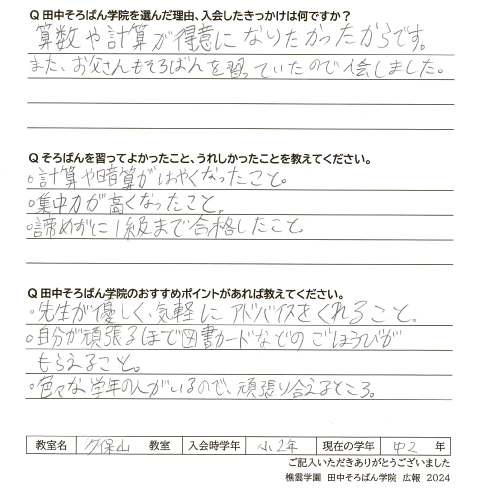 また、お父さんもそろばんを習っていたので入会しました。