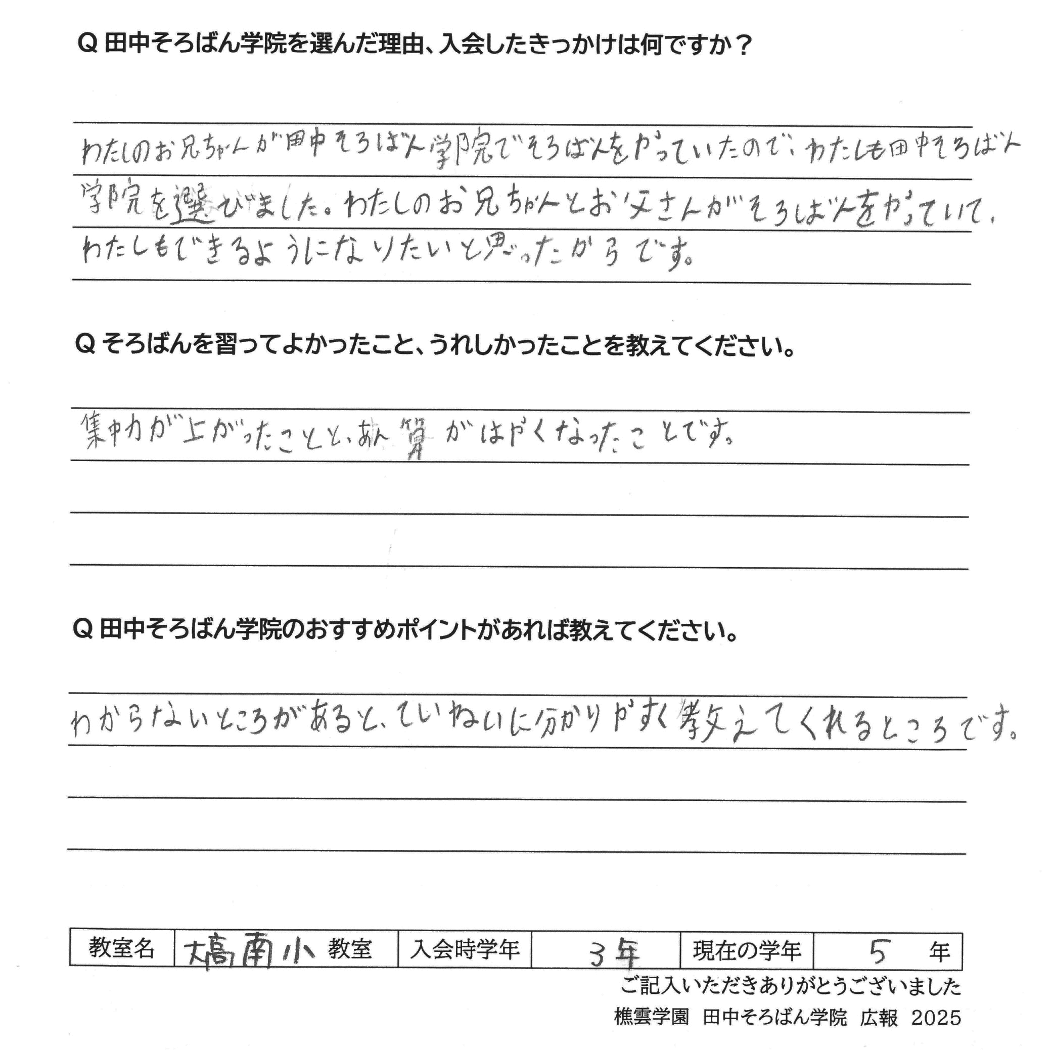 私のお兄ちゃんが田中そろばん学院でそろばんをやっていたので、私も田中そろばん学院を選びました。私のお兄ちゃんとお父さんがそろばんをやっていて、わたしもできるようになりたいと思ったからです。