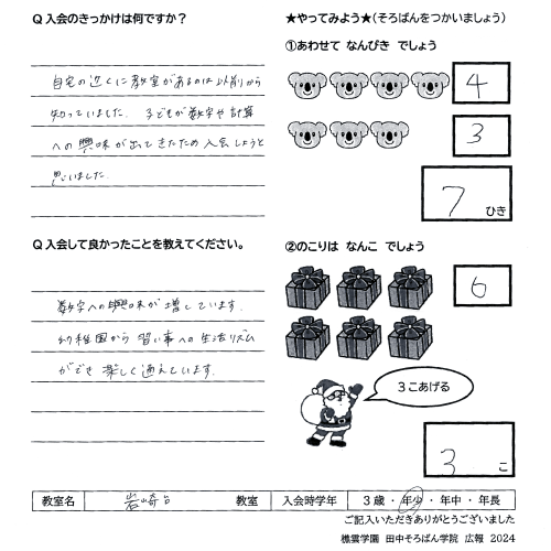 自宅の近くに教室があるのは以前から知っていました。子どもが数字や計算への興味が出てきたため入会しようと思いました。