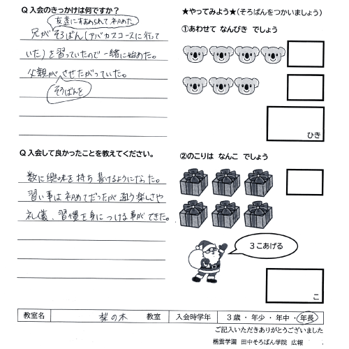 数に興味を持ち書けるようになった。習い事は初めてだったが通う楽しさや礼儀、習慣を身につける事ができた。