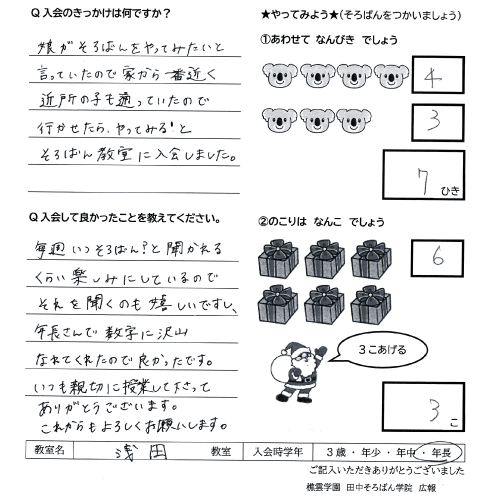 毎週 いつそろばん?と聞かれるくらい楽しみにしているのでそれを聞くのも嬉しいですし、年長さんで数字に沢山なれてくれたので良かったです。